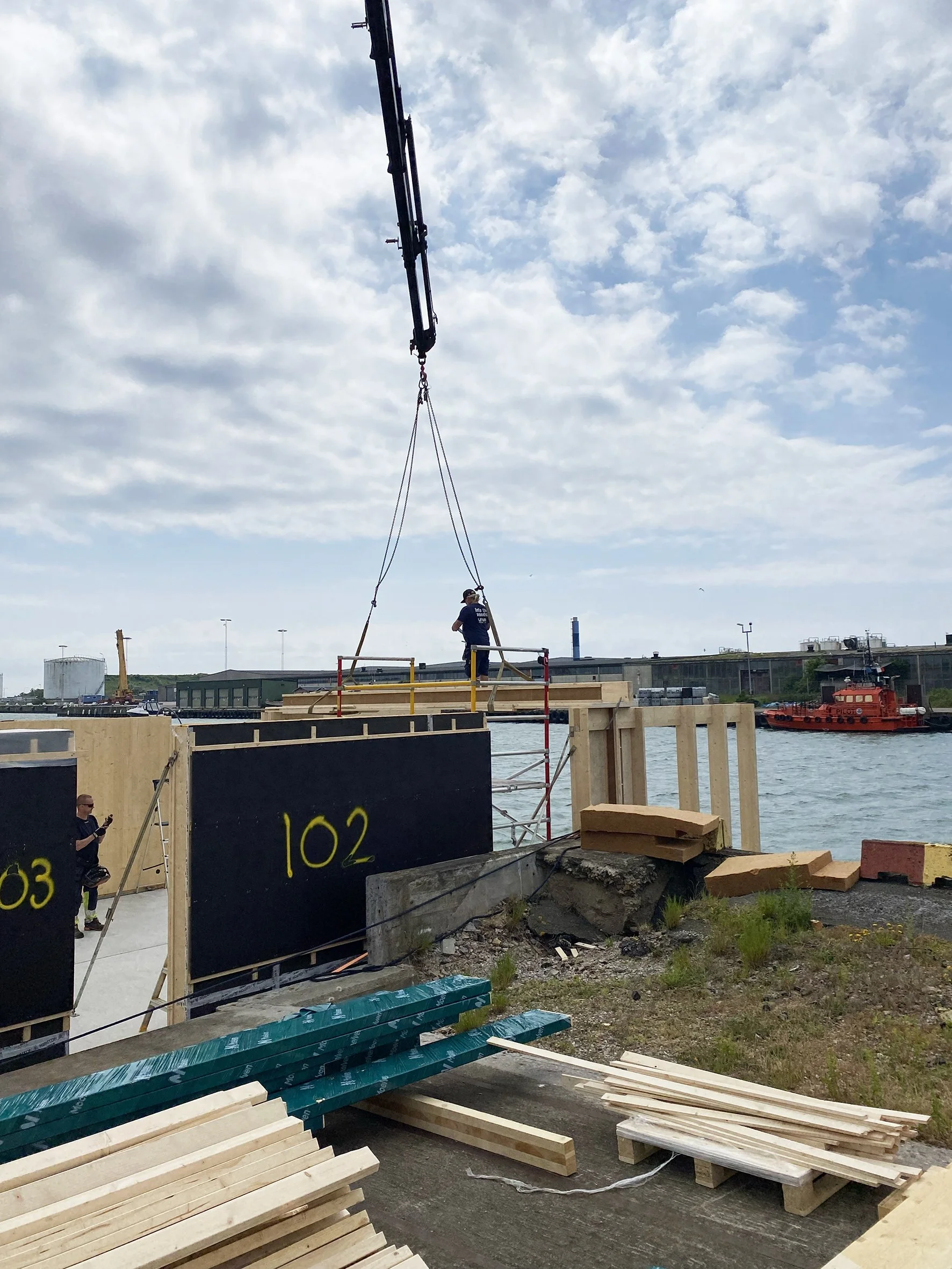 Väggarna prefabricerade vi delvis inne i en hall i hamnen. Väggar och tak lyftes på plats med kranbil. Fönster och stora partier monterades också med kranbil då det var omöjligt att bygga ställningar runt om. Vi var ett team med hantverkare från Skåne för allt som skulle ske. Logistiken var det som mest utmanade oss och vädrets makter med en hel del regnande.