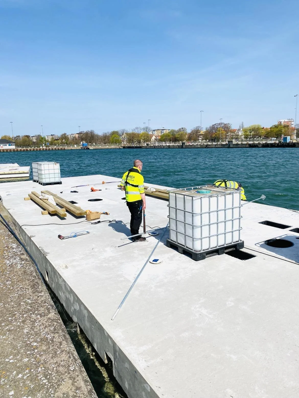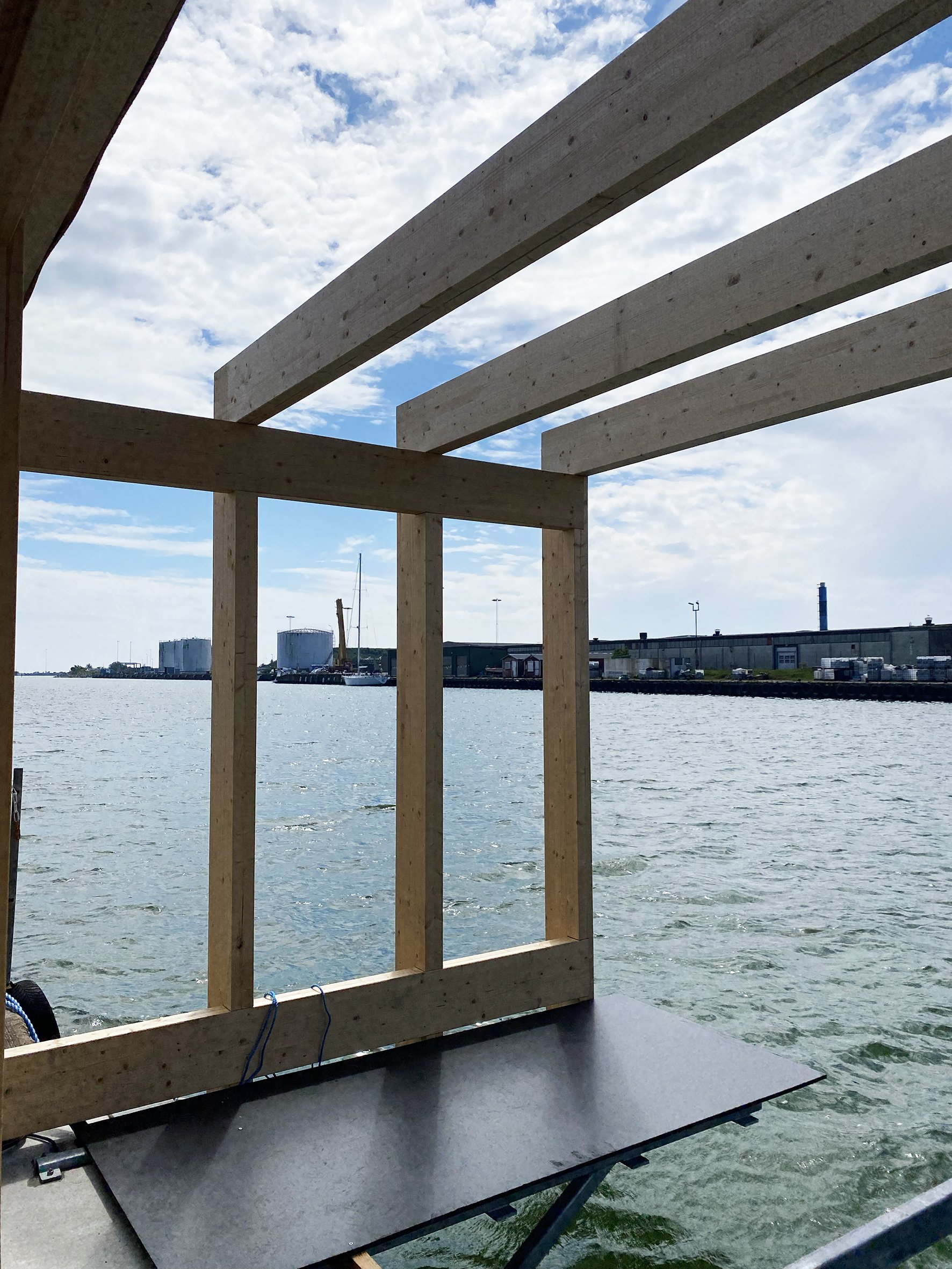 Hela bygget behövde ske på vattnet, så vi hyrde in oss i Trelleborgs hamn. Byggstart 1 maj. Därifrån till vår deadline i mitten av augusti då den skulle fraktas över sundet innan höststormar med max 0-3 meter / sek som var kravet för överresan, så hade vi en otroligt tight byggprocess.